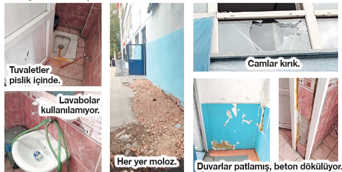 Teneffüse çıkan öğrencilerin ciğeri, okul koridorlarındaki koşuşturmadan kalkan tozla doluyor. Veliler, her sabah elleriyle bıraktıkları yavrularının çürük bina kaygısıyla hayatlarından, pislik nedeniyle sağlıklarından endişe duyuyor.