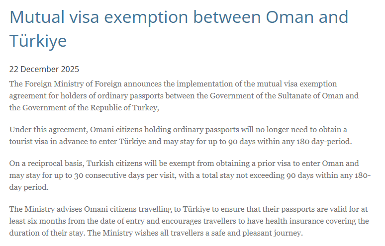 Umman Sultanlığı Dışişleri Bakanlığı, Umman Sultanlığı ile Türkiye arasında sıradan pasaport sahiplerini kapsayan karşılıklı vize muafiyeti anlaşmasının resmen yürürlüğe girdiğini açıkladı.